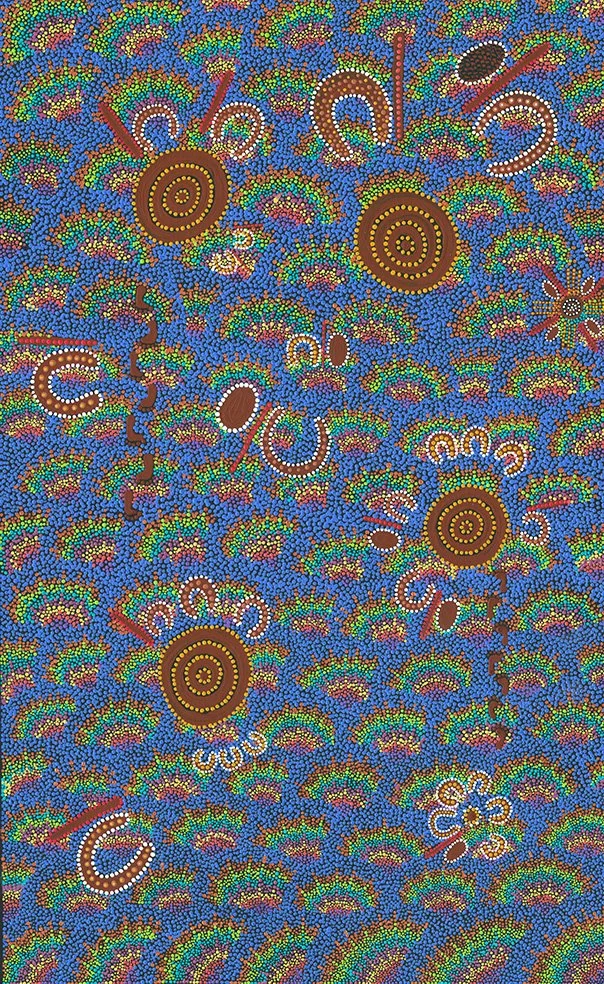 The painting depicts myself, my grandmother and clusters of young girls being taught the ways and traditions of the Central Desert People.